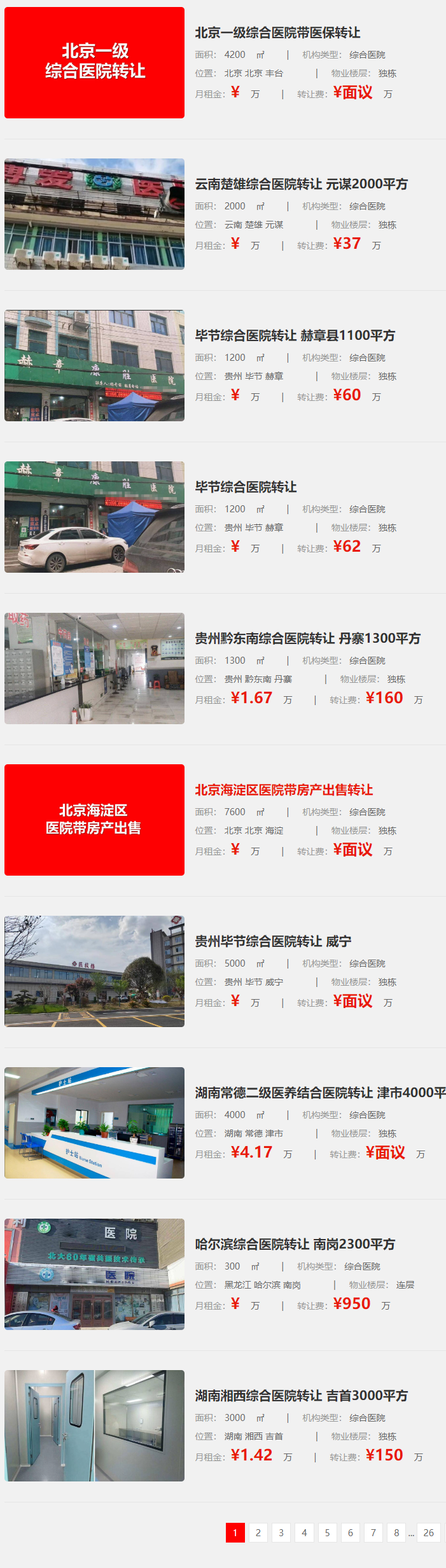 江西宜春一家4500平方米的綜合醫(yī)院轉(zhuǎn)讓,位于奉新縣,物業(yè)樓層為獨棟。黑龍江大慶一家3000平方米的綜合醫(yī)院轉(zhuǎn)讓,位于讓胡路區(qū),物業(yè)樓層為獨棟。哈爾濱也有一家2000平方米的綜合醫(yī)院轉(zhuǎn)讓,位于松北區(qū),物業(yè)樓層為連層。