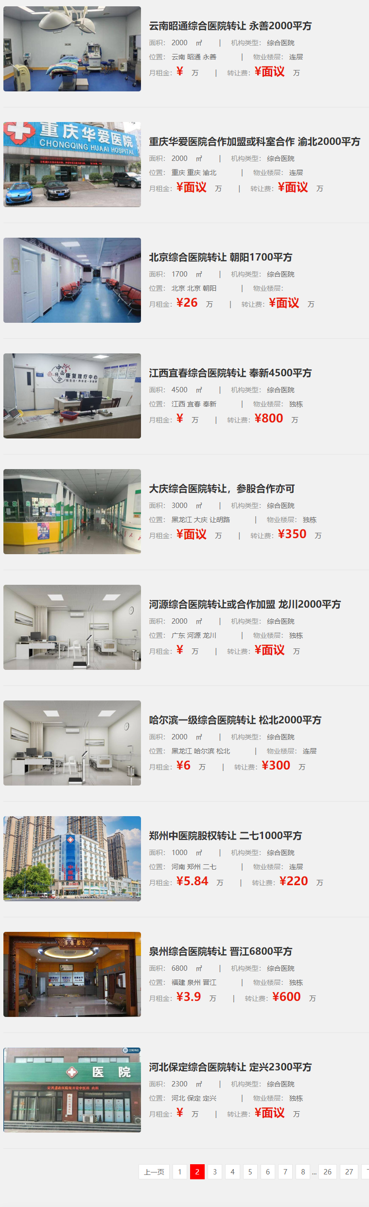 鄭州一家1000平方米的中醫(yī)院股權(quán)轉(zhuǎn)讓,位于二七區(qū),物業(yè)樓層為連層。泉州一家6800平方米的綜合醫(yī)院轉(zhuǎn)讓,位于晉江市,物業(yè)樓層為獨棟。河北保定一家2300平方米的綜合醫(yī)院轉(zhuǎn)讓,位于定興縣,物業(yè)樓層為獨棟。