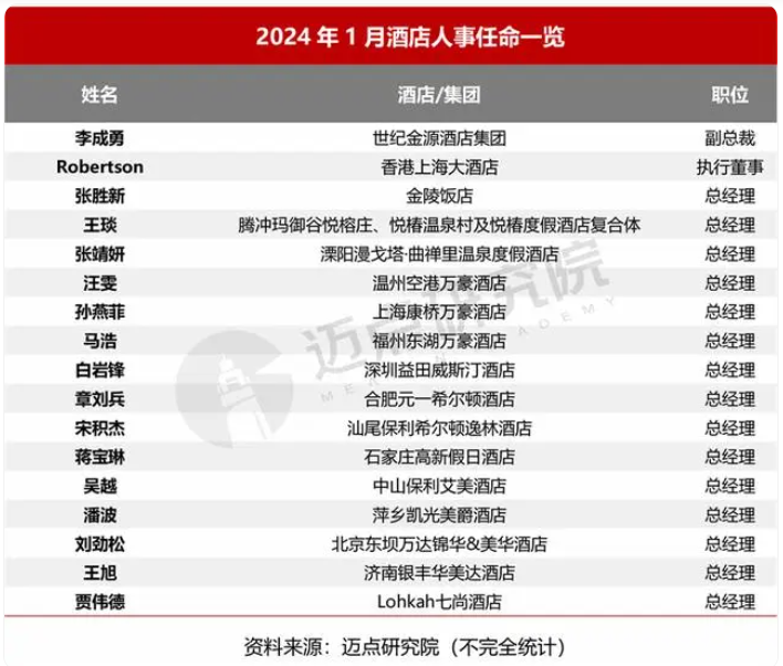 據(jù)邁點(diǎn)研究院不完全統(tǒng)計(jì),2024年1月共有30位酒店高管履新,其中涉及洲際、雅高、朗廷、希爾頓、萬豪、萬達(dá)、世紀(jì)金源、金陵飯店等多個(gè)奢華、高端酒店集團(tuán)及品牌。