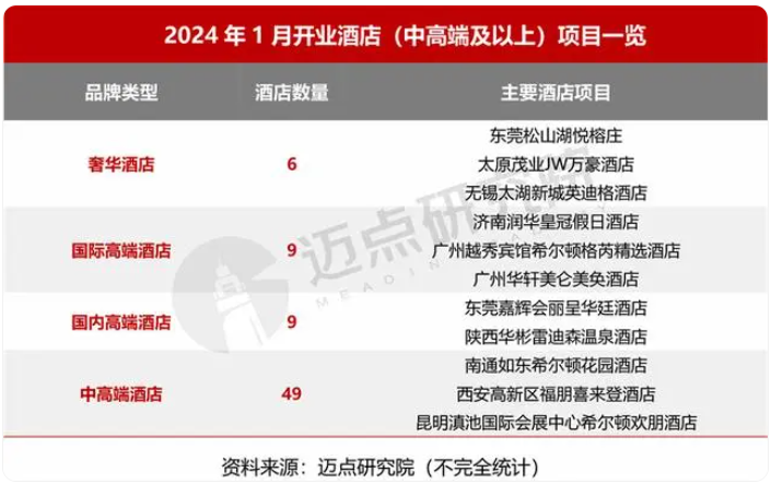 據(jù)邁點(diǎn)研究院不完全統(tǒng)計(jì),2024年1月新開業(yè)酒店(中高端及以上)73家。酒店類型占比上,中高端酒店為49家;國(guó)際高端酒店9家;國(guó)內(nèi)高端酒店9家、奢華酒店6家。
