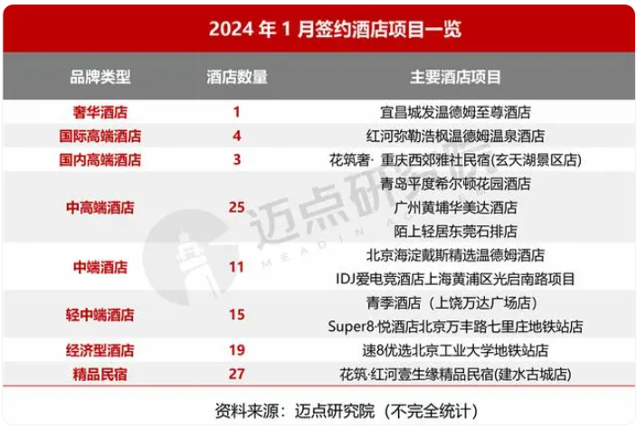 據(jù)邁點(diǎn)研究院不完全統(tǒng)計(jì),2024年1月中國(guó)酒店市場(chǎng)新簽約項(xiàng)目105家。品牌類型上,奢華酒店簽約1家,國(guó)際高端酒店簽約4家、國(guó)內(nèi)高端酒店簽約3家、中高端酒店簽約25家、中端酒店簽約11家、輕中端酒店簽約15家、經(jīng)濟(jì)型酒店簽約19家、精品民宿簽約27家。