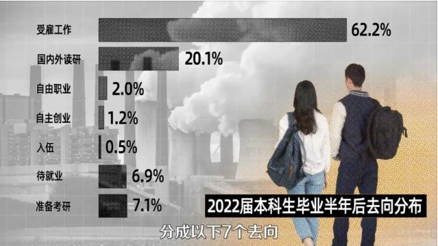 我們通常把畢業(yè)后的半年,分成以下7個去向,除去準備考研和待就業(yè)之外的5個,統(tǒng)稱為“就業(yè)有落實”——當然這5項里占比最高的肯定是受雇工作,排第二的就是考上了研。