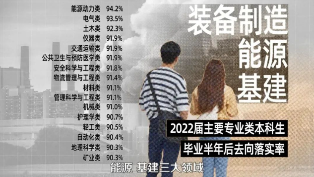 以此為標準,根據(jù)麥可思研究院最新發(fā)布的《2023年中國本科生就業(yè)報告》中的數(shù)據(jù),2022屆本科生畢業(yè)半年后,更容易找到工作或考上研究生的,就是裝備制造、能源、基建三大領(lǐng)域。