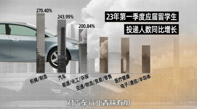 另外在《2023海外留學(xué)人才就業(yè)發(fā)展報告》中,也能發(fā)現(xiàn)今年上半年畢業(yè)的留學(xué)生,對汽車行業(yè)青睞有加,甚至超過了能源,僅次于制造業(yè)。