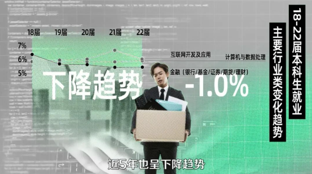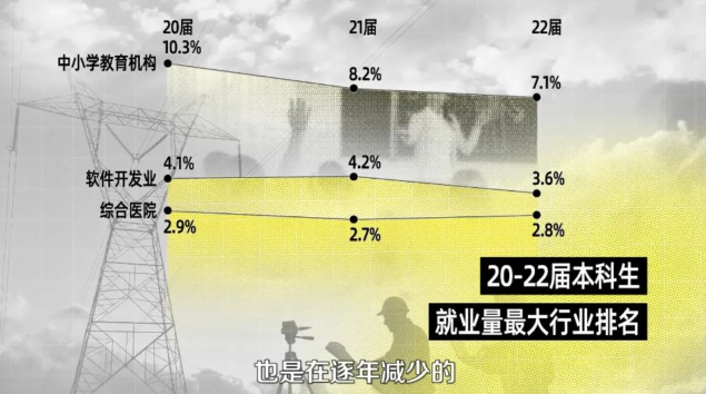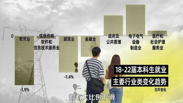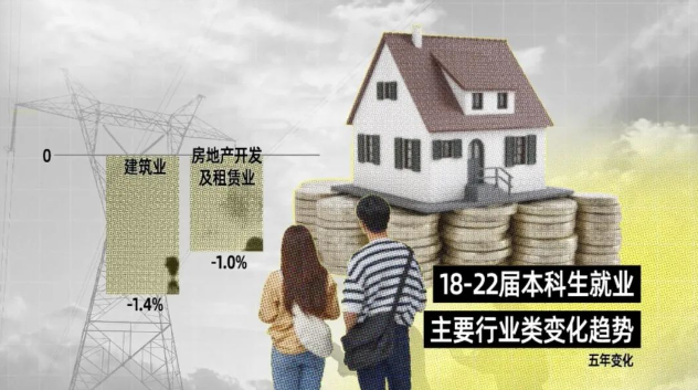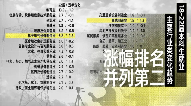 首先從大行業(yè)來看,2022屆本科畢業(yè)生相比五年前,投身教育、建筑、房地產(chǎn)的,都有大比例下滑。