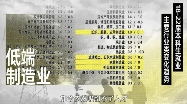 不過也不難看出,這些漲幅大的多數(shù)是中高端制造業(yè),往表格下面看,不少低端制造業(yè),5年前本科生不愛去,如今依然吸引不了人才。
