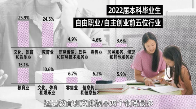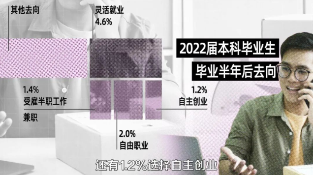 先看傳統(tǒng)行業(yè),根據(jù)麥可思的數(shù)據(jù),2022屆本科畢業(yè)生中,有4.6%的人畢業(yè)半年后選擇了靈活就業(yè),其中包括1.4%的受雇半職工作,也就是我們常說的兼職,2.0%選擇了自由職業(yè),還有1.2%選擇自主創(chuàng)業(yè)。