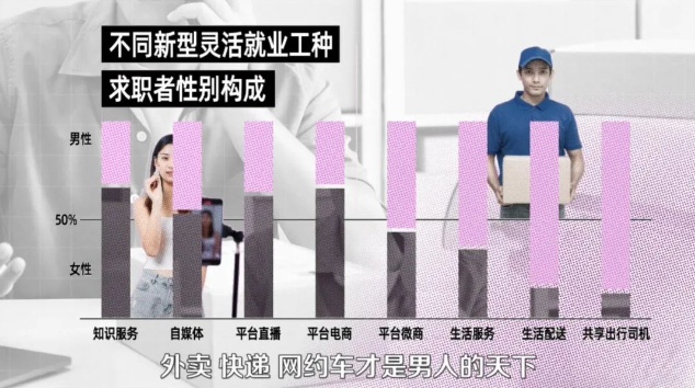 而相對光鮮亮麗一點的直播、帶貨、自媒體,則是女性有絕對的優(yōu)勢,外賣、快遞、網(wǎng)約車才是男人的天下。