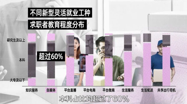 最后我們來看看最“高端”的工種——自媒體,在一個人人都可以做5分鐘博主的時代,能靠做自媒體站著掙錢的,對學(xué)歷的要求也非常高,本科占比均找過了60%。