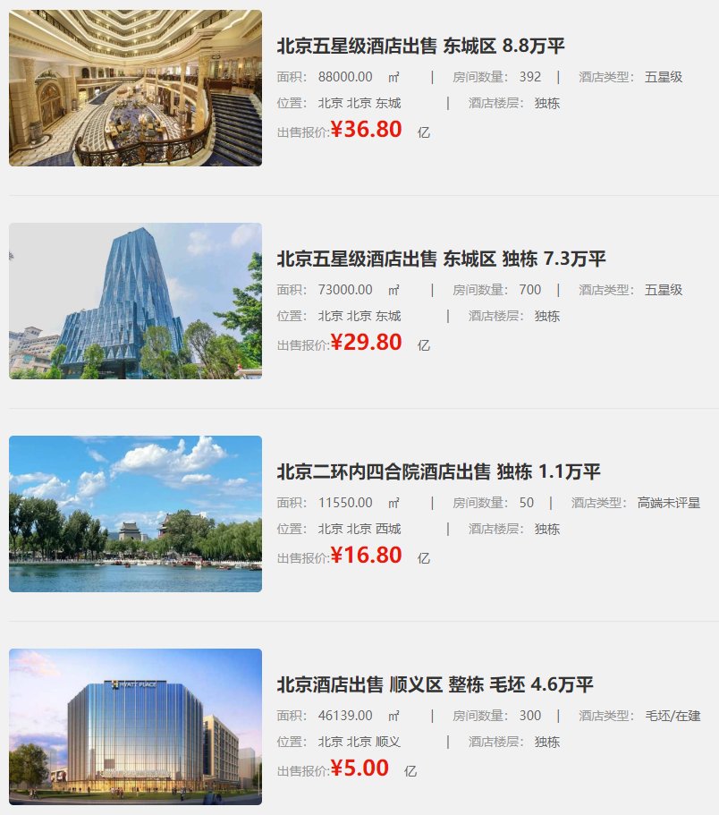 除此之外,東城區(qū)還有多處五星級(jí)酒店轉(zhuǎn)讓出售,其中包括面積8.8萬平方米,房間數(shù)量392的酒店,報(bào)價(jià)36.8億元;面積7.3萬平方米,房間數(shù)量700的酒店,報(bào)價(jià)29.8億元。西城區(qū)的四合院酒店,面積1.1萬平方米,房間數(shù)量50,報(bào)價(jià)16.8億元。順義區(qū)的整棟毛坯酒店,面積4.6萬平方米,房間數(shù)量300,報(bào)價(jià)5億元。