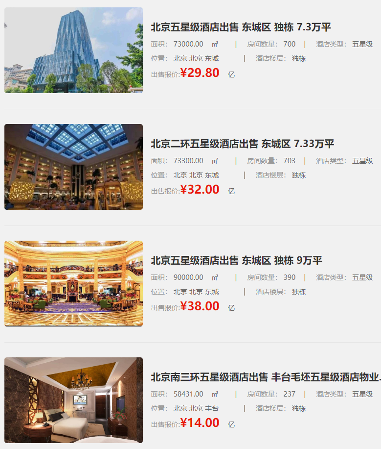 首先,位于順義區(qū)的園林式四星級(jí)酒店,面積達(dá)6萬平方米,擁有300個(gè)房間,報(bào)價(jià)21億元。此外,東城區(qū)的五星級(jí)酒店,面積9萬平方米,房間數(shù)量390,報(bào)價(jià)36.7億元。另一處天安門旁的五星級(jí)酒店,面積2.55萬平方米,房間數(shù)量170,報(bào)價(jià)18億元。豐臺(tái)區(qū)的五星級(jí)酒店,面積8萬平方米,房間數(shù)量336,報(bào)價(jià)28億元。