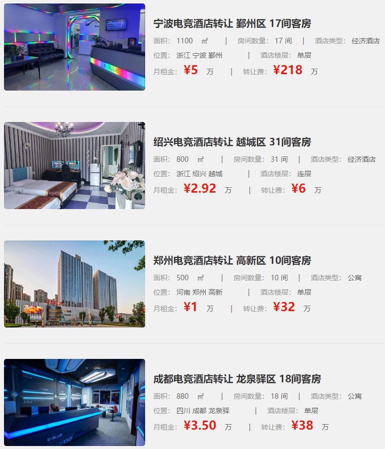 紹興越城區(qū)的一家31間客房的經(jīng)濟(jì)型電競酒店,轉(zhuǎn)讓費(fèi)僅為6萬元,成為了市場上的熱門轉(zhuǎn)讓標(biāo)的。鄭州高新區(qū)的10間客房的公寓型電競酒店,轉(zhuǎn)讓費(fèi)為32萬元,同樣備受關(guān)注。