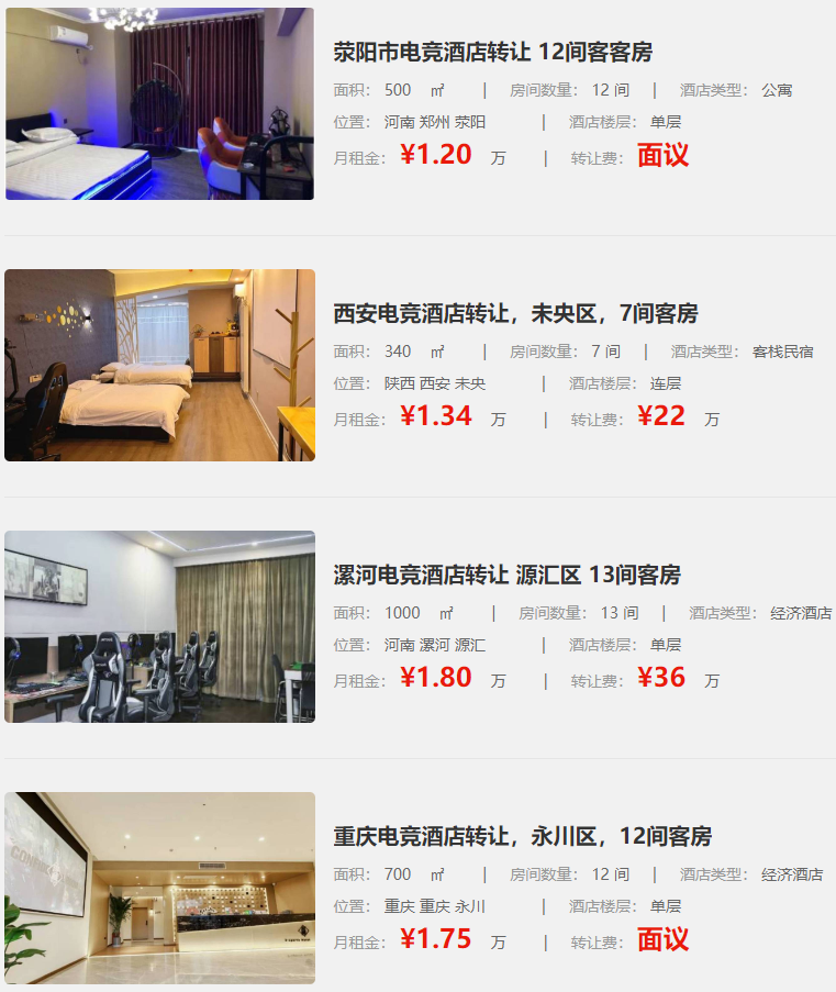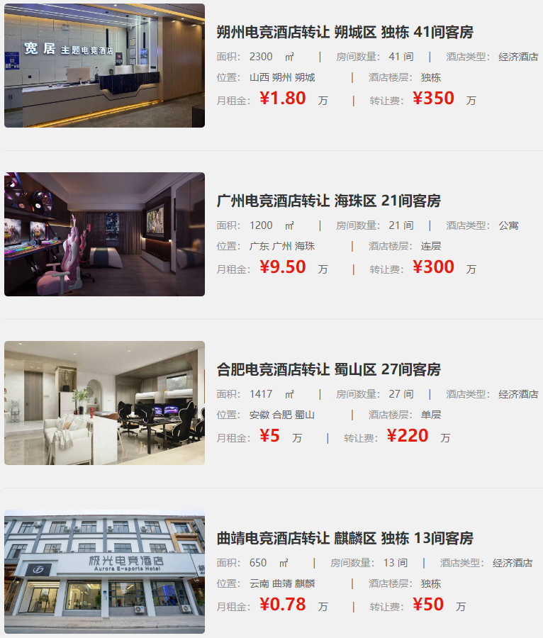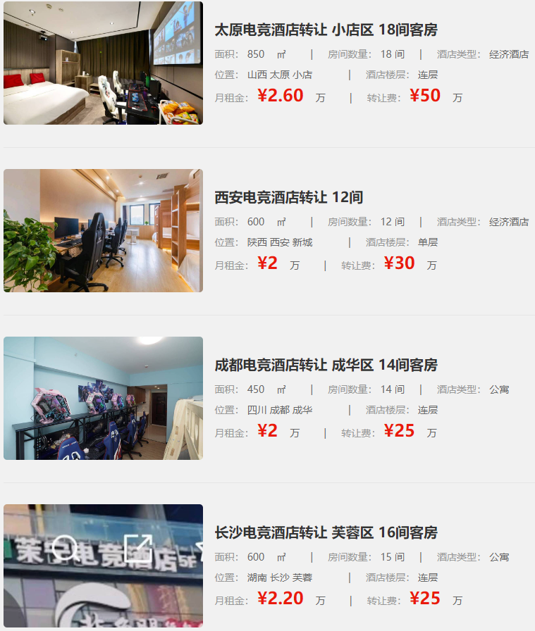 湖南長沙縣和山西太原小店區(qū)的電競酒店也分別以150萬元和50萬元的轉(zhuǎn)讓費(fèi)尋求新東家。西安新城區(qū)的一家12間客房的經(jīng)濟(jì)型電競酒店,轉(zhuǎn)讓費(fèi)為30萬元,成都成華區(qū)的14間客房的公寓型電競酒店,轉(zhuǎn)讓費(fèi)為25萬元。