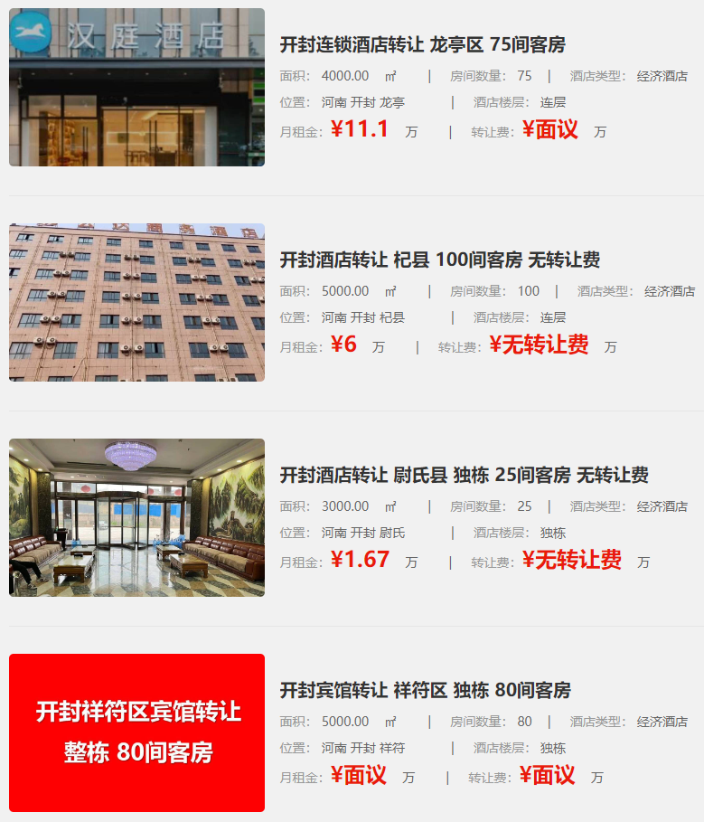 開封市的酒店轉讓市場近期活躍,多個經濟型酒店正在尋找新的投資者。以下是幾個主要轉讓項目的信息: