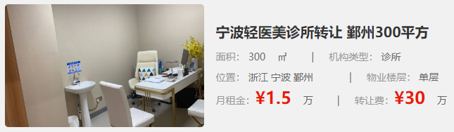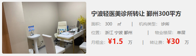 另一家300㎡的輕醫(yī)美診所也位于寧波鄞州區(qū),剛完成重新裝修,地理位置優(yōu)越,停車方便。該診所的轉(zhuǎn)讓費為30萬元,物業(yè)租金為1.50萬元/月,剩余租期為2年。