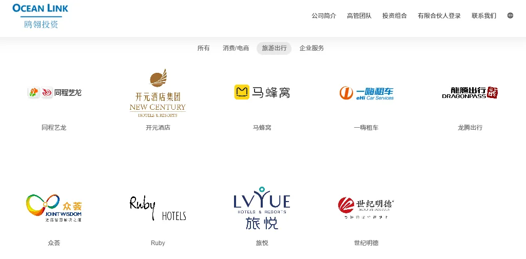 鷗翎官網(wǎng)信息顯示:鷗翎投資Ocean Link是一家專注于亞洲消費(fèi)、旅行與互聯(lián)網(wǎng)產(chǎn)業(yè)的私募股權(quán)投資公司。目前官網(wǎng)上,僅公開展示的旅游出行類投資對(duì)象,就有9個(gè):同程藝龍、馬蜂窩、一嗨租車、龍騰出行、眾薈、旅悅、世紀(jì)明德、開元酒店和Ruby酒店(后二者已并入德朧)。