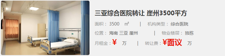 三亞一綜合醫(yī)院,現(xiàn)出售,可醫(yī)保報(bào)銷。面積3500平米,已開設(shè)內(nèi)、外、中西醫(yī)結(jié)合、婦科、影像、檢驗(yàn)。設(shè)備齊全,有CT、大生化全套、免疫發(fā)光、彩超等。位置佳,有穩(wěn)定客源,接手可盈利,正常營(yíng)業(yè)中,有意者請(qǐng)撥打電話聯(lián)系。非誠(chéng)勿擾!
