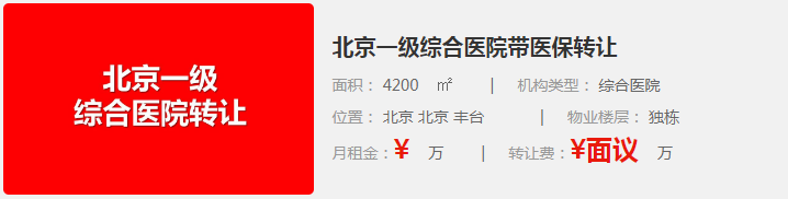 醫(yī)院轉(zhuǎn)讓 北京一級(jí)綜合醫(yī)院 營(yíng)利性 北京市醫(yī)保定點(diǎn) 面積4200平,全新裝修 有互聯(lián)網(wǎng)診療資質(zhì),ct,x光資質(zhì)齊全, 食堂資質(zhì),免費(fèi)停車場(chǎng)。