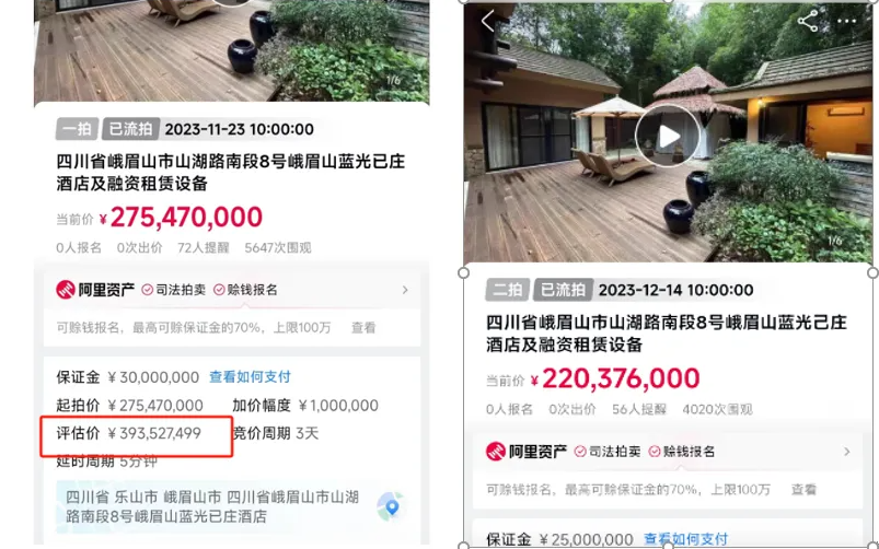 《每日經(jīng)濟(jì)新聞》記者通過阿里拍賣查詢到,2023年11月,己莊酒店及融資租賃設(shè)備被打包拍賣,評估價(jià)高達(dá)3.935億元,起拍價(jià)為2.7547億元,但因?yàn)闊o人報(bào)名競拍,遭遇了首次流拍。2023年12月,己莊被二次拍賣,起拍價(jià)降至2.2億元,比之前降低約5500萬元,但仍無人報(bào)名、無人出價(jià),再次流拍。