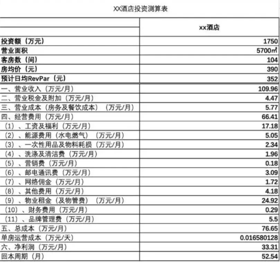 通過這樣一整條邏輯計(jì)算下來,一家酒店的投資回報(bào)周期就計(jì)算出來了。