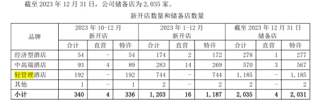 但1200-1400家的拓店計劃,恐怕開店的主力軍還是輕管理酒店。它 的 儲備店中,輕管理酒店占比超過50%。