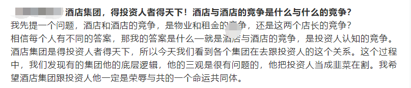 酒店集團出發(fā)點也并不想把酒店投資人當成韭菜,他們是利益共同體,想收割的韭菜是酒店住客?;谌魏蝹€人或團體都不會主動放棄既得利益,當酒店集團的利益受到影響時,酒店投資人的利益必然是要先“犧牲”掉。
