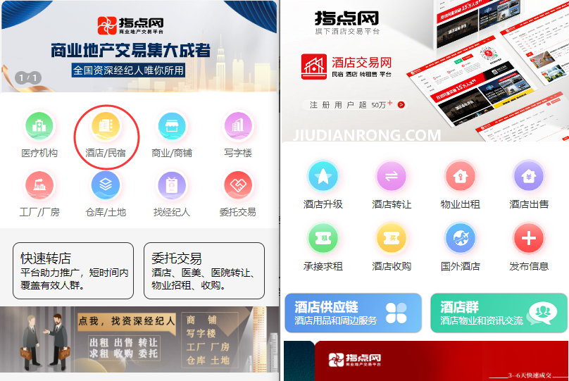 指點(diǎn)網(wǎng)旗下酒店交易網(wǎng)是國(guó)內(nèi)最大的酒店轉(zhuǎn)讓物業(yè)交易平臺(tái),注冊(cè)用戶超50萬(wàn)。平臺(tái)致力于提供國(guó)內(nèi)外酒店轉(zhuǎn)讓、酒店物業(yè)招租、酒店資產(chǎn)出售、酒店周邊產(chǎn)品與服務(wù)信息等綜合服務(wù),打造真實(shí)有效的酒店交易平臺(tái),已是酒店行業(yè)必用平臺(tái)之一。