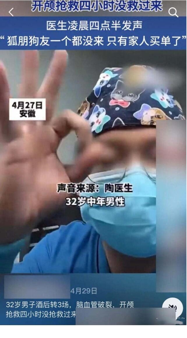某整形機(jī)構(gòu)醫(yī)生陶某(賬號(hào)“老陶說(shuō)真話”,粉絲148.4萬(wàn);賬號(hào)“我最勇敢”,粉絲17.4萬(wàn)),近日在多平臺(tái)發(fā)布手術(shù)室場(chǎng)景的視頻稱:一位病人與朋友喝酒、唱歌、泡澡后突發(fā)腦血管爆裂,經(jīng)搶救仍未脫離危險(xiǎn)。