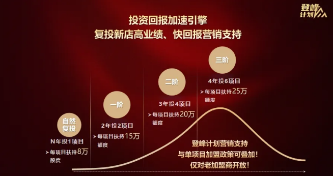 登峰計劃一方面確保了投資人的長期利益,在面對市場波動時更加從容不迫;另一方面,通過這種滾動多店并投的方式,投資人也能同一時期獲得多店收益,達(dá)成更高的事業(yè)成就。