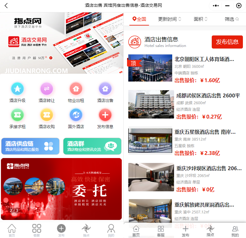 指點(diǎn)網(wǎng)旗下酒店交易網(wǎng)是國內(nèi)最大的酒店轉(zhuǎn)讓物業(yè)交易平臺,注冊用戶超50萬。平臺致力于提供國內(nèi)外酒店轉(zhuǎn)讓、酒店物業(yè)招租、酒店資產(chǎn)出售、酒店周邊產(chǎn)品與服務(wù)信息等綜合服務(wù),打造真實(shí)有效的酒店交易平臺,已是酒店行業(yè)必用平臺之一。
