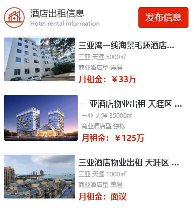 其中,一家位于吉陽區(qū)核心地段的中端酒店,面積為4800平方米,擁有66間客房,月租金為9.5萬元,轉(zhuǎn)讓費(fèi)為650萬元。另一家大東海附近的高端未評(píng)星酒店,面積達(dá)10073平方米,擁有125間客房,月租金為25萬元,轉(zhuǎn)讓費(fèi)為1400萬元。此外,還有一家位于吉陽區(qū)大東海的經(jīng)濟(jì)酒店,面積為12000平方米,擁有155間客房,月租金為36萬元,轉(zhuǎn)讓費(fèi)為200萬元。