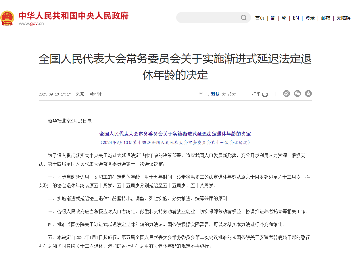 為了深入貫徹落實黨中央關(guān)于漸進式延遲法定退休年齡的決策部署,適應(yīng)我國人口發(fā)展新形勢,充分開發(fā)利用人力資源,根據(jù)憲法,第十四屆全國人民代表大會常務(wù)委員會第十一次會議決定: