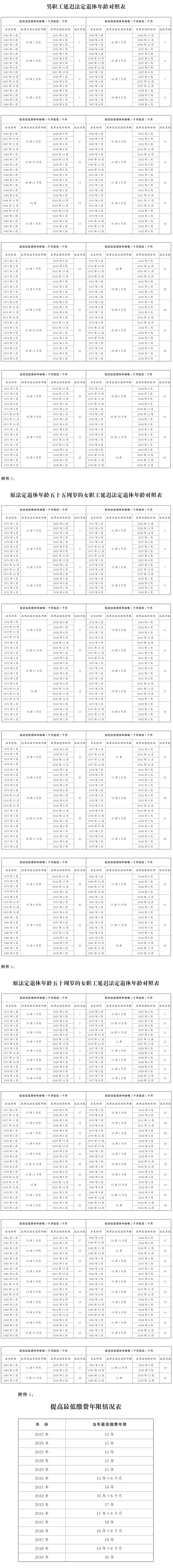 第一條 從2025年1月1日起,男職工和原法定退休年齡為五十五周歲的女職工,法定退休年齡每四個月延遲一個月,分別逐步延遲至六十三周歲和五十八周歲;原法定退休年齡為五十周歲的女職工,法定退休年齡每二個月延遲一個月,逐步延遲至五十五周歲。國家另有規(guī)定的,從其規(guī)定。