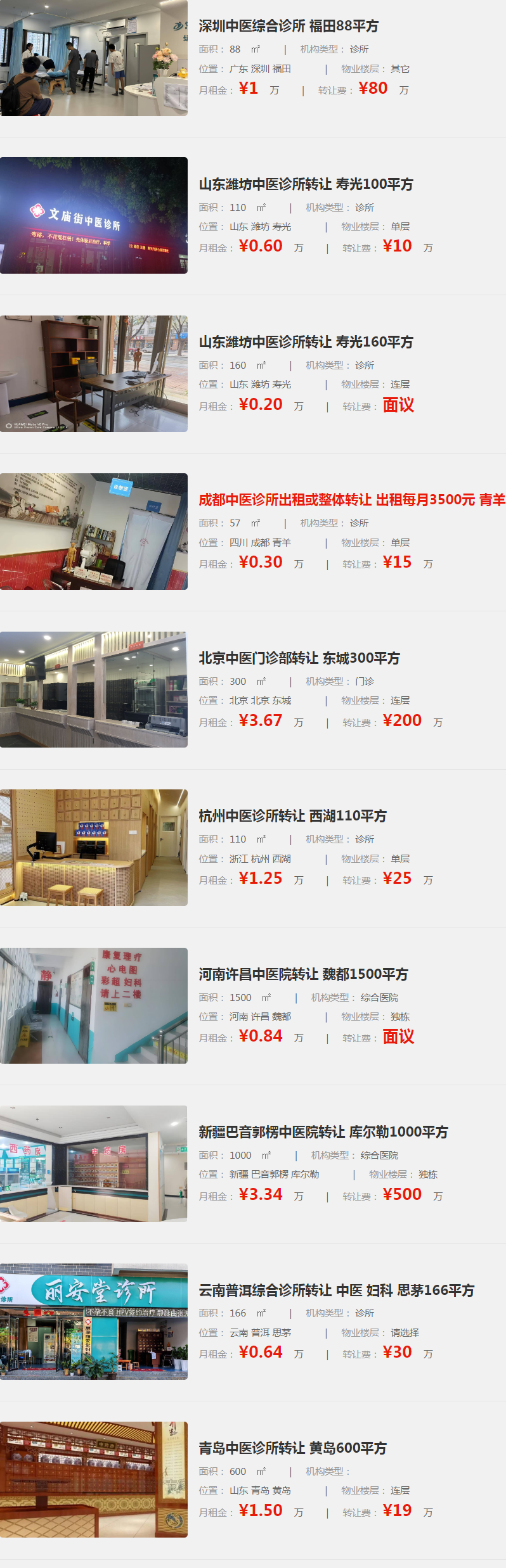 指點網(wǎng)匯集了全國范圍內(nèi)的醫(yī)療機構(gòu)轉(zhuǎn)讓信息,包括綜合醫(yī)院、??漆t(yī)院、門診部、診所等多種類型,涵蓋了不同地理位置、面積、價格等詳細參數(shù),為投資者提供了廣闊的選擇空間。
