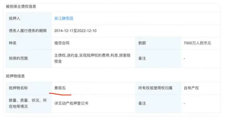 景觀石抵押給銀行7000萬元。企查查APP截圖