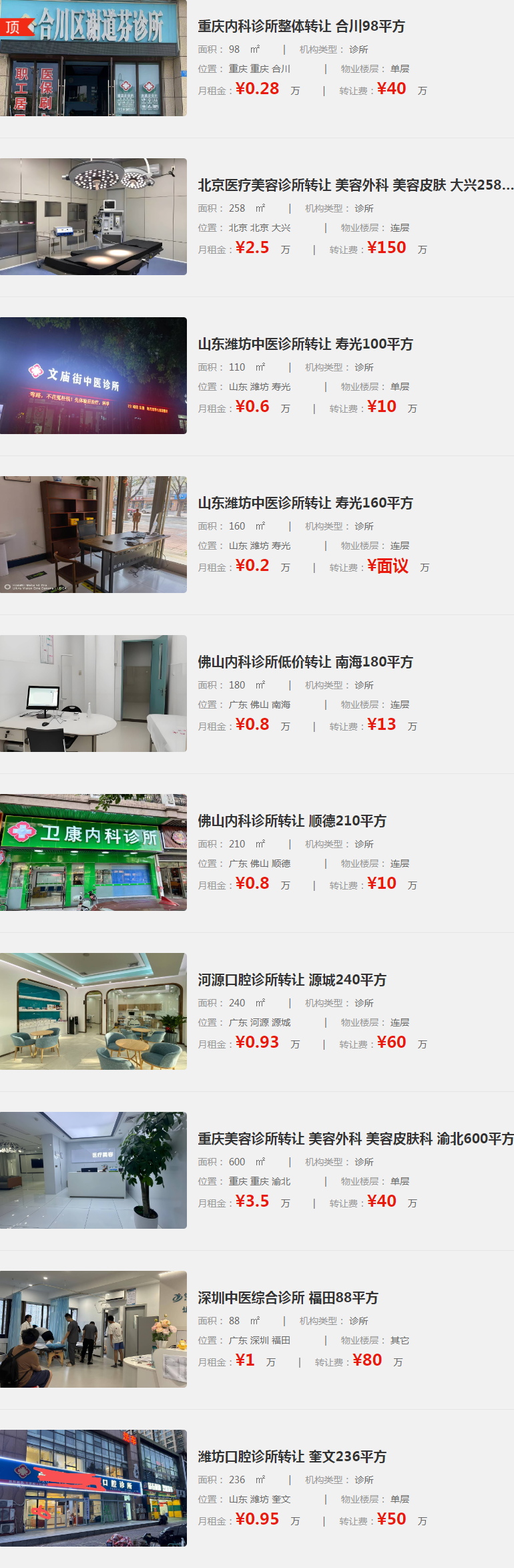 從山城重慶到首都北京,從山東濰坊到廣東佛山、深圳,我們覆蓋了全國多個(gè)熱門城市的診所轉(zhuǎn)讓信息。無論是98平米的內(nèi)科診所,還是600平米集美容外科、美容皮膚科于一體的大型美容診所,多樣化的面積與類型,滿足不同醫(yī)療機(jī)構(gòu)的經(jīng)營需求。特別是山東濰坊的兩家中醫(yī)診所,以其獨(dú)特的中醫(yī)文化魅力和合理的租金,成為中醫(yī)愛好者的優(yōu)選。
