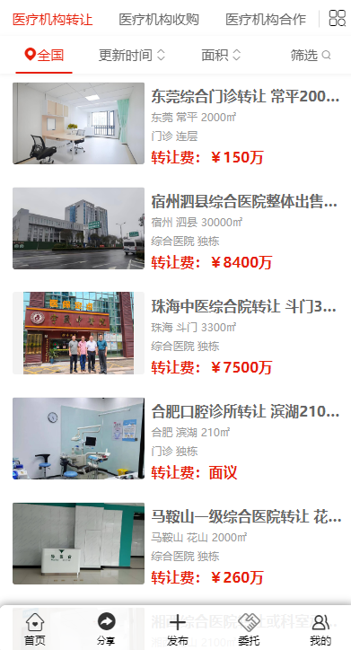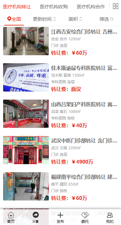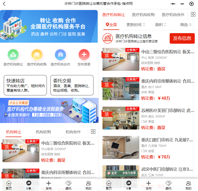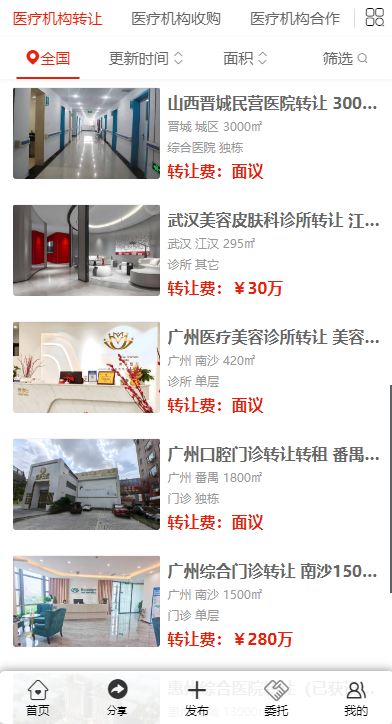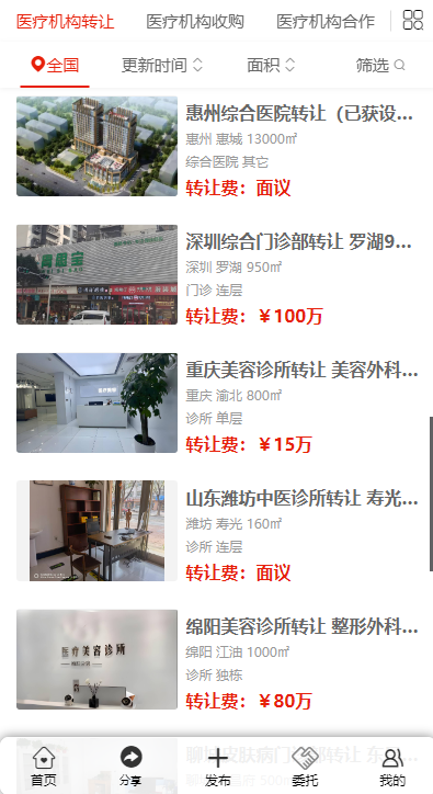 該平臺上展示了來自全國各地豐富多樣的醫(yī)療機構轉讓信息。例如在重慶九龍坡,有一家面積為 700㎡的口腔門診尋求轉讓,其物業(yè)樓層為連層,月租金 2.8 萬,轉讓費 70 萬。湖北武漢江岸區(qū)的一家中醫(yī)門診部也在轉讓之列,面積 310㎡,同樣位于連層物業(yè),轉讓費面議。