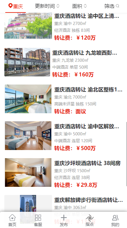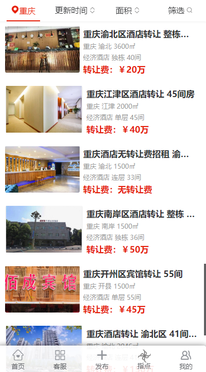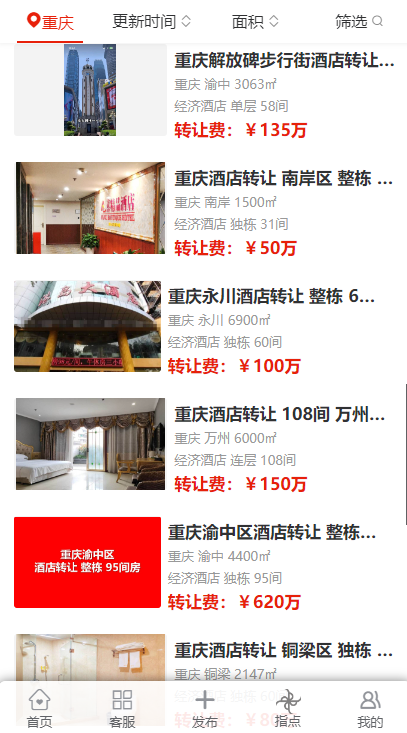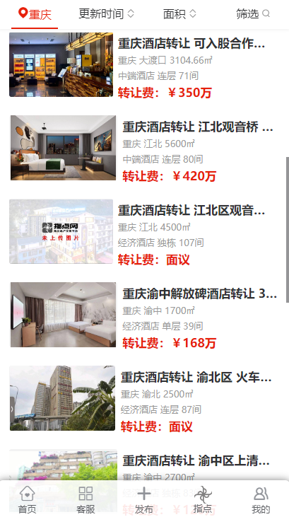 在重慶的多個區(qū)域,包括渝北區(qū)、酉陽區(qū)、江北區(qū)、渝中區(qū)、大渡口區(qū)、九龍坡區(qū)、沙坪壩區(qū)、南岸區(qū)、永川區(qū)以及萬州區(qū)等,都出現(xiàn)了不同規(guī)模和類型的酒店轉(zhuǎn)讓信息。這些酒店涵蓋了經(jīng)濟酒店、中端酒店以及高端未評星酒店,規(guī)模從面積 1500㎡到 7000㎡不等,房間數(shù)量從 31 間到 150 間各異。