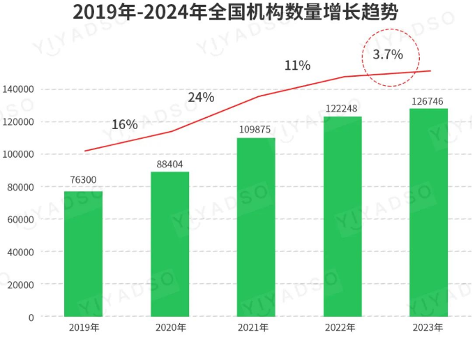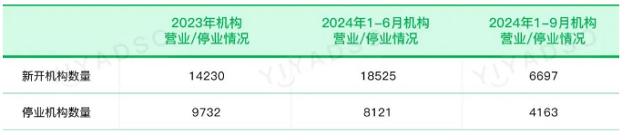 從以上統(tǒng)計數(shù)據(jù)上可以看出,2024年大部分新開機構(gòu)都集中在1-6月份上半年。而截至到2024年9月底無論是新開還是停業(yè)的機構(gòu)總數(shù)都遠遠超出2023年整個年度。