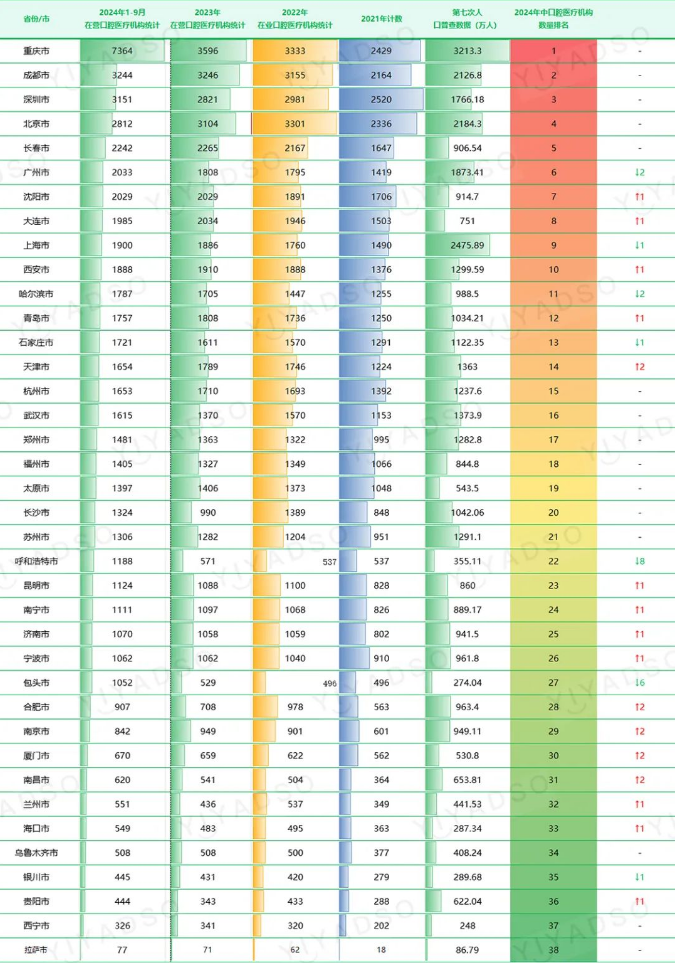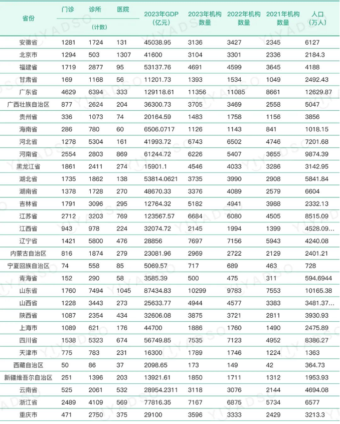 以上為全國31個省份直轄市自治區(qū)截至到2024年9月30日的口腔醫(yī)療機構(gòu)在工商注冊和經(jīng)營狀態(tài)的機構(gòu)數(shù)量,以及2023,2022,2021的過往三年數(shù)據(jù)對比統(tǒng)計表。