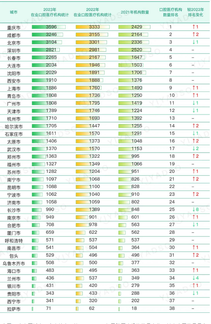 全國38個主要城市(含直轄市)的2021-2023 年口腔醫(yī)療機構(gòu)數(shù)量變化。其中全國數(shù)量最多的是重慶市 3596家,其次是成都市 3246家,之后是北京和深圳。去年負增長的城市包括:北京、深圳、武漢、福州、昆明、濟南、長沙、合肥、??凇⑻m州、貴陽。