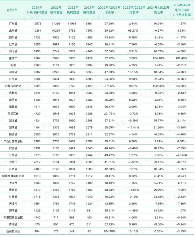 2,目前全國機構(gòu)數(shù)量最多的省份還是廣東省,截至到2024年9月30日總數(shù)量為12576家,已經(jīng)連續(xù)3年正增長狀態(tài)。其次是山東省總數(shù)為10261家,本年度呈現(xiàn)略微負增長。第三名為四川省總數(shù)7722家也是連續(xù)三年正增長。