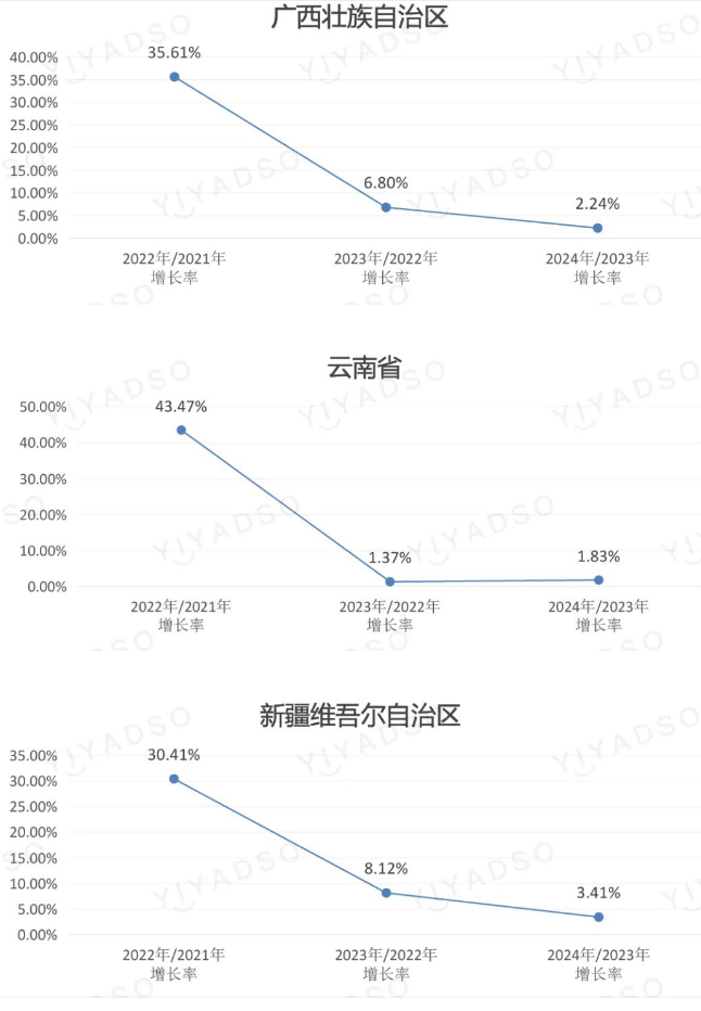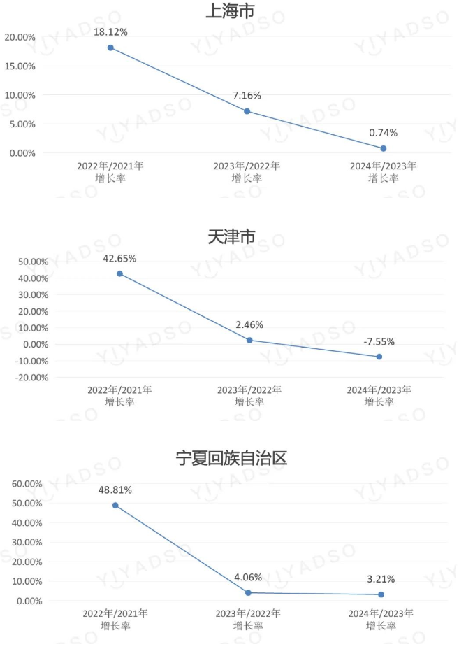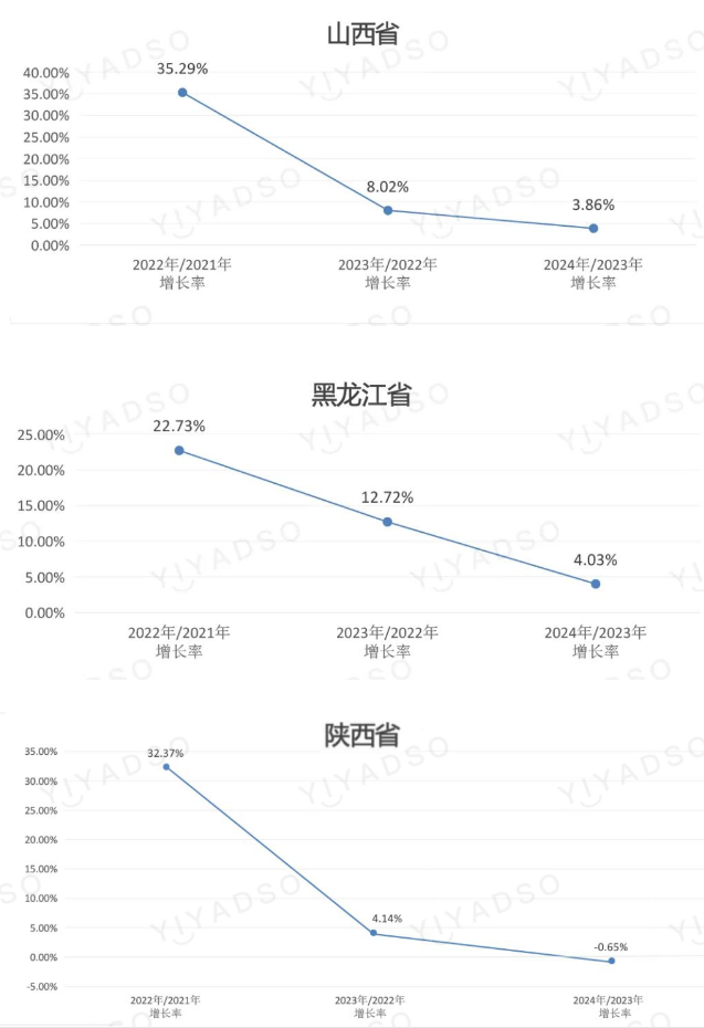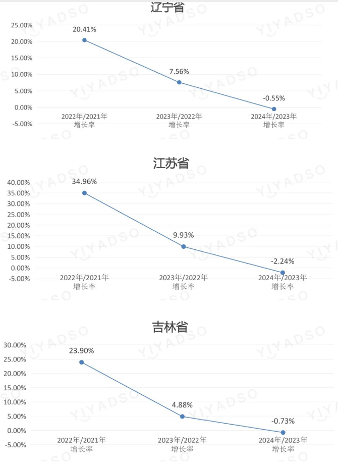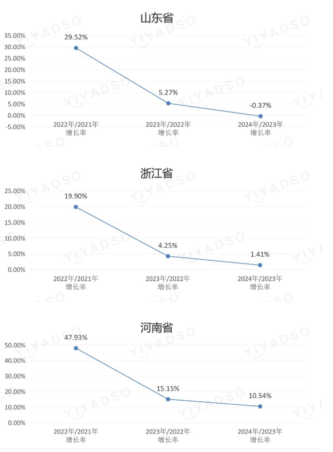 全國呈現(xiàn)增長變緩的省份直轄市自治區(qū)包括:山東、浙江、河南、遼寧、江蘇、吉林、山西、黑龍江、陜西、廣西壯族自治區(qū)、云南省、新疆維吾爾自治區(qū)、上海、天津、寧夏回族自治區(qū)、青海、西藏自治區(qū)、其中截至到2024年9月底呈現(xiàn)負增長的是:山東、遼寧、吉林、江蘇、陜西、天津、青海。而河南省連續(xù)三年保持超過10%的增長。