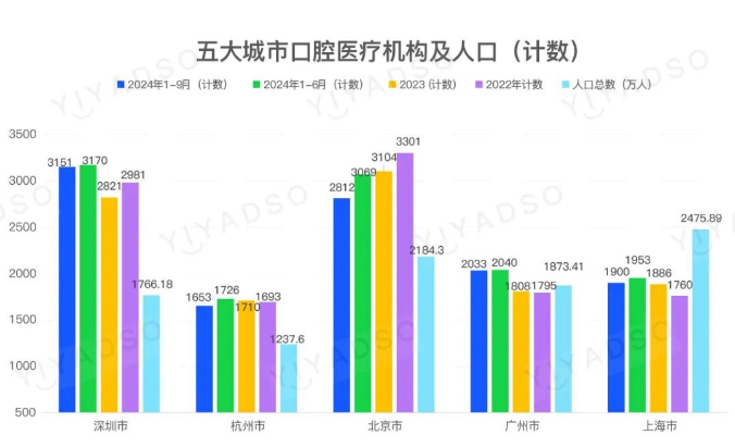 四,一線城市2022年-2024年口腔醫(yī)療機構(gòu)數(shù)量和人口數(shù)據(jù)分析圖