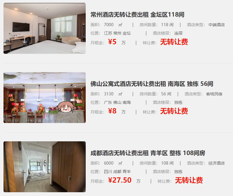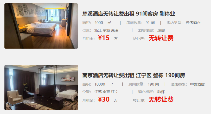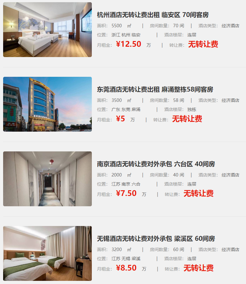 在成都,既有 2000㎡、60 間房的經(jīng)濟(jì)型酒店,也有 14000㎡、120 間房的中端酒店在尋求無(wú)轉(zhuǎn)讓費(fèi)出租;深圳同樣有大量酒店,如 9000㎡、110 間房的中端酒店和 12000㎡、198 間房的四星級(jí)酒店對(duì)外出租,月租金從幾十萬(wàn)到一百多萬(wàn)不等。類似的情況在江蘇、廣東、浙江、四川、河北等多個(gè)省份的城市中頻繁出現(xiàn)。這些酒店規(guī)模各異,從幾千平方米到數(shù)萬(wàn)平方米不等,房間數(shù)量從幾十間到幾百間都有,涵蓋了經(jīng)濟(jì)酒店、中端酒店、高端未評(píng)星酒店甚至四星級(jí)酒店等多種類型。