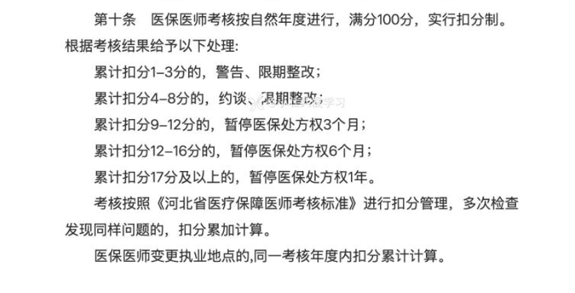 醫(yī)保醫(yī)師考核按自然年度進行,滿分100分,實行扣分制。根據(jù)考核結果給予以下處理: