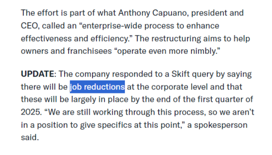 據(jù)Skift報(bào)道,萬(wàn)豪計(jì)劃進(jìn)行近十年來(lái)最大規(guī)模的組織調(diào)整,預(yù)計(jì)從2025年起每年節(jié)省8000萬(wàn)到9000萬(wàn)美元,其中包括在公司層面的裁員。裁員事宜,預(yù)計(jì)到2025年第一季度結(jié)束前基本完成。