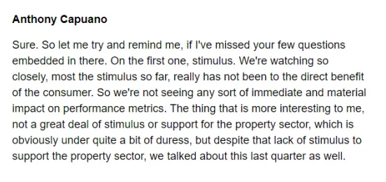 “我們正在密切關(guān)注中國(guó)市場(chǎng)的情況,目前多數(shù)刺激措施都未給消費(fèi)者帶來(lái)直接的好處。暫未看到任何對(duì)具體指標(biāo)產(chǎn)生的直接和實(shí)質(zhì)性影響。對(duì)房地產(chǎn)行業(yè)的刺激和支持措施也還不夠多。”