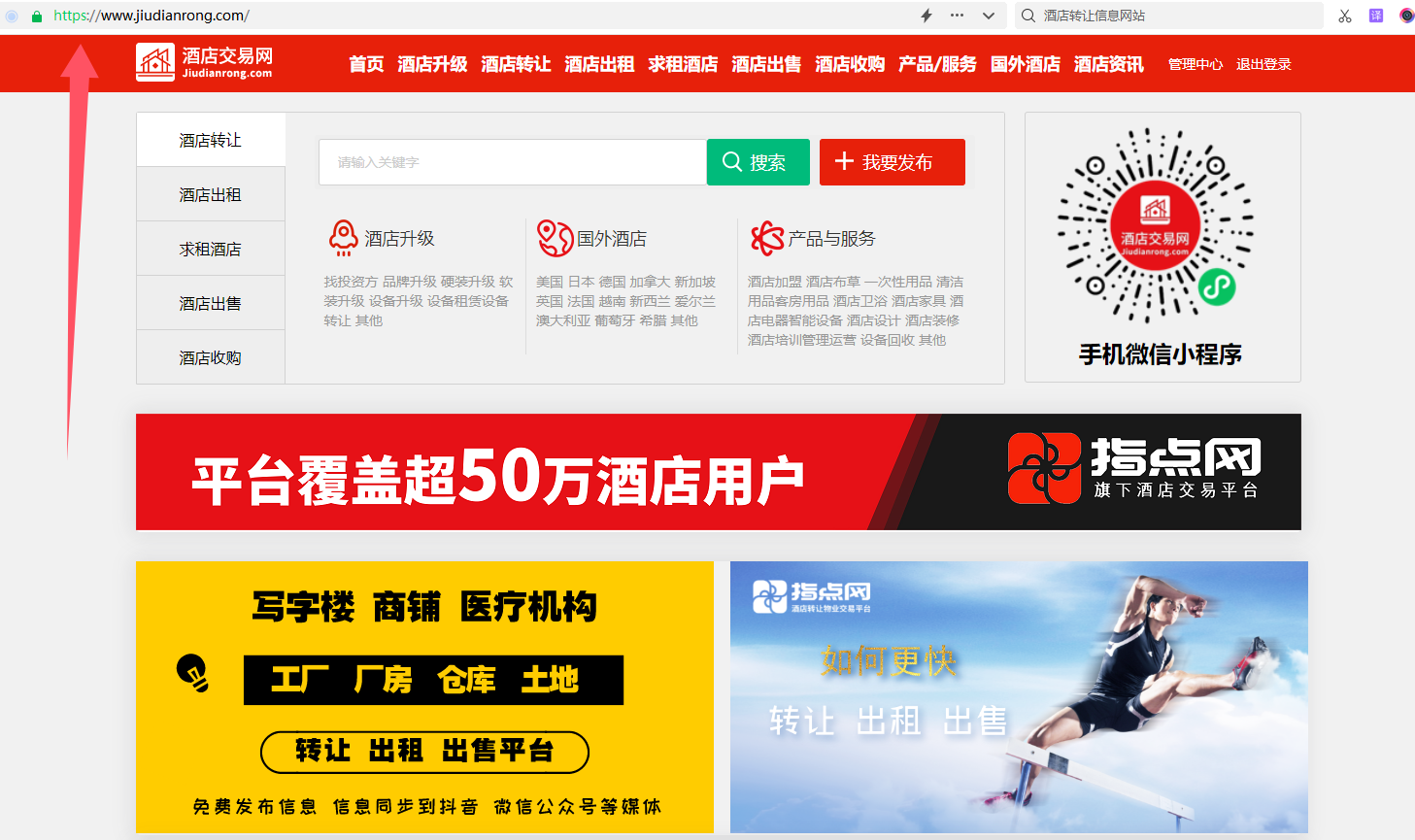 www.jiudianrong.com:指點(diǎn)網(wǎng)旗下酒店交易網(wǎng),是國(guó)內(nèi)較大的酒店轉(zhuǎn)讓、出租、出售交易平臺(tái),也是民宿相關(guān)交易的大平臺(tái),平臺(tái)不做中介,不受理委托,不做居間,不參與交易,交易雙方可自行在該平臺(tái)發(fā)布和篩選民宿或酒店信息,酒店行業(yè)注冊(cè)用戶已超過50萬。