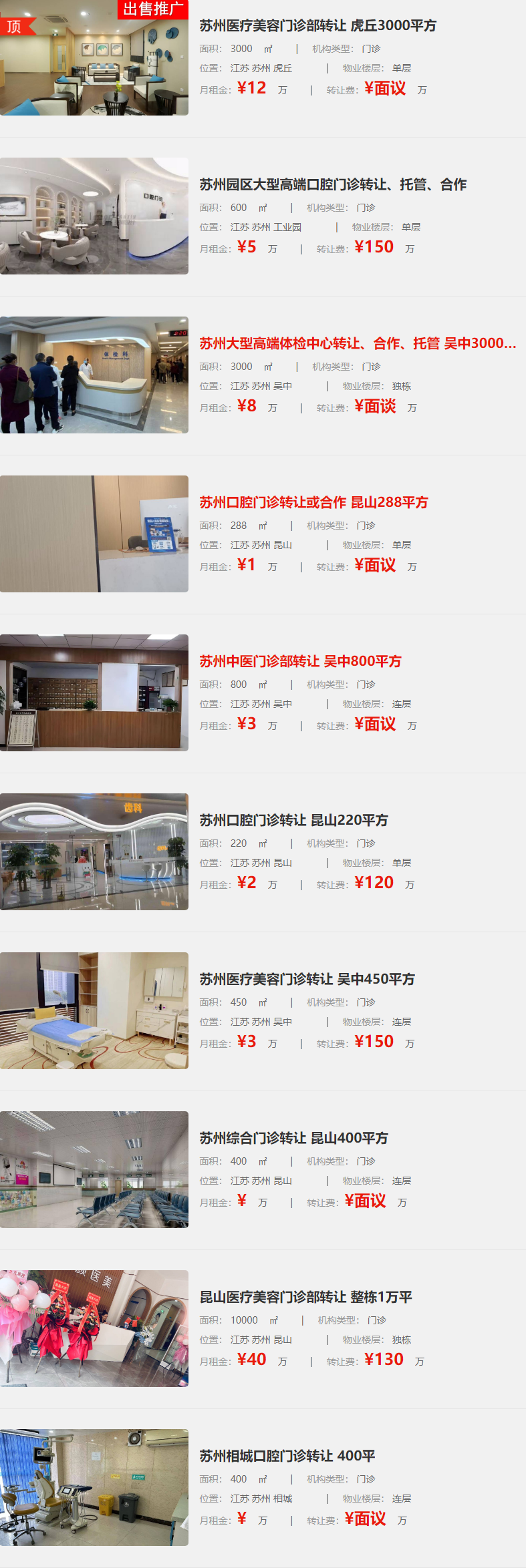 指點(diǎn)網(wǎng)轉(zhuǎn)讓平臺(tái),作為專業(yè)的門診轉(zhuǎn)讓樞紐,具備諸多無可比擬的優(yōu)勢(shì)。首先,平臺(tái)匯聚了豐富多樣的門診資源。從虎丘 3000 平米的醫(yī)療美容門診部,到園區(qū) 600 平米的高端口腔門診;從吳中 3000 平米的大型高端體檢中心,到昆山不同規(guī)模的口腔、綜合及醫(yī)療美容門診,再到相城的口腔門診等,涵蓋了各種類型、各種規(guī)模、各個(gè)區(qū)域的門診轉(zhuǎn)讓信息。這使得無論是尋求特定類型門診的接手者,還是有廣泛投資意向的買家,都能在平臺(tái)上找到心儀的目標(biāo)。